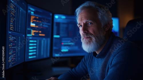 senior programmer with a gray beard focuses intently on numerous computer screens displaying complex code and data during the quiet atmosphere of late evening