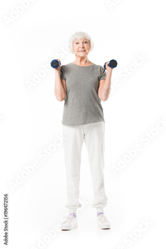 Senior sportswoman doing excercise with dumbbells isolated on white