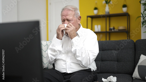 senior watching movie crying at home