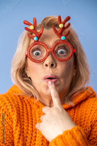 Senior woman holding thumbs up and showing shocked expression wearing Xmas glasses