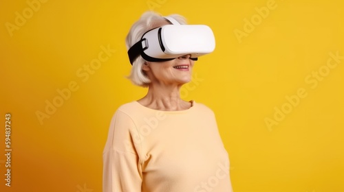 senior woman playing in virtual reality glasses. Created with generative AI.