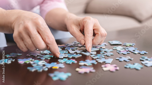 Senior woman playing jigsaw puzzle at home, empty space