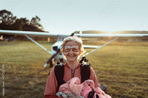 Senior woman smiling after skydiving with airplane in background