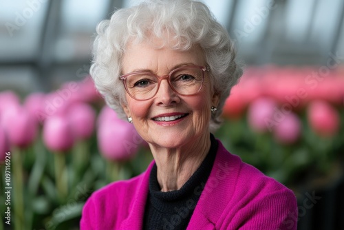 Senior woman smiling in a flower garden surrounded by vibrant tulips