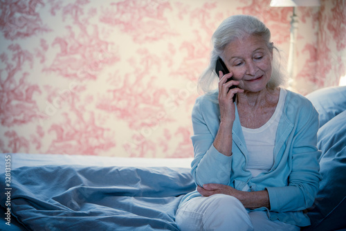 Senior woman talking on smart phone while sitting on bed in bedroom at home