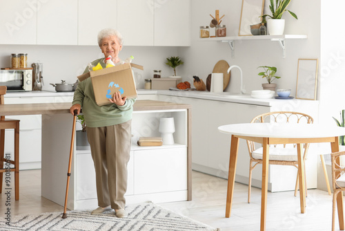 Senior woman with box of garbage in kitchen. Waste sorting concept
