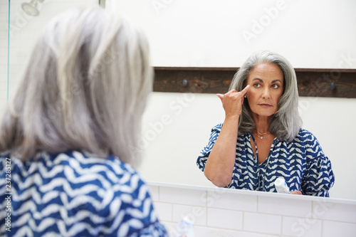 Senior woman with grey hair putting on moisturizer in bathroom mirror