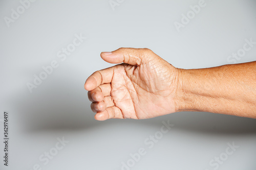 Senior woman's wrinkled hand on white background . Old hands of senior lady with freckles and clearly visible veins reaching