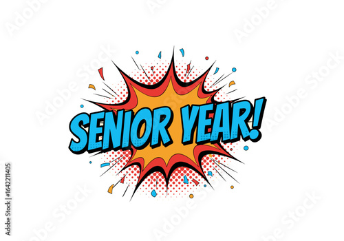 Senior Year! Comic book style pop art illustration for graduation and school celebration.