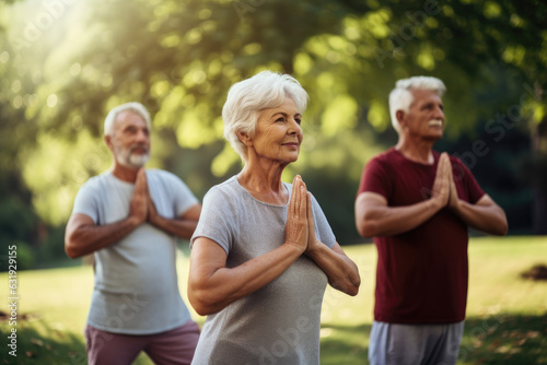 Seniors Embody Active Ageing and Wellness as They Practice Yoga in a Lush Green Park