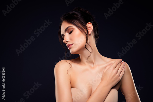Sensual young woman with elegant makeup and flawless skin gazing softly, wearing a strapless outfit