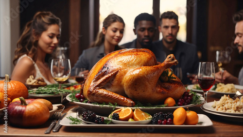 Сenterpiece of holiday feast, perfectly roasted turkey, on dinner table. Its golden-brown skin glistens in warm light, enticing everyone with irresistible aroma. Family gathered around festive table