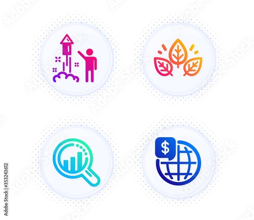 Seo analysis, Fireworks and Organic tested icons simple set. Button with halftone dots. World money sign. Targeting chart, Party pyrotechnic, Bio ingredients. Global markets. Science set. Vector