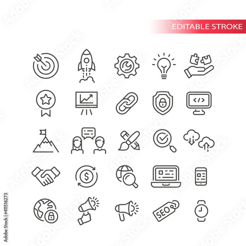 Seo line vector icon set. Search engine optimization, website symbols. Web business outline icons, editable stroke.