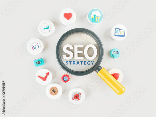 SEO strategy with icons and magnifying glass in creative layout