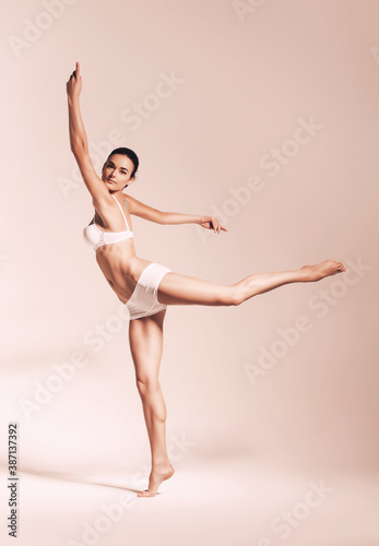 sepia ballerina dancing in white underwear