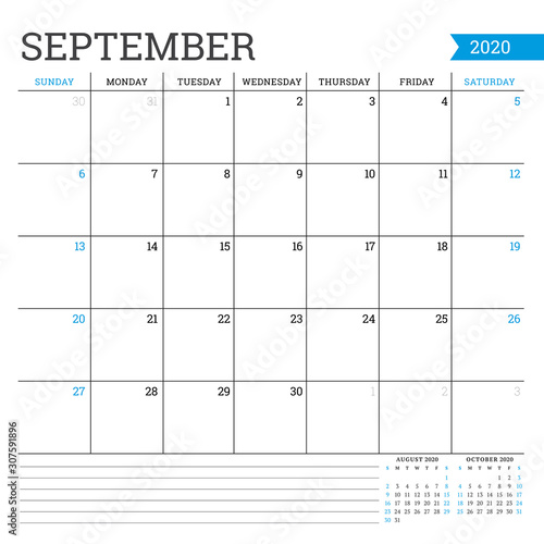 September 2020. Square monthly calendar. Planner template. Minimalist style. Vector illustration. Week starts on Sunday