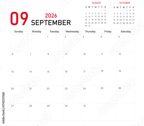 September month calendar layout of 2026 | Monthly diary planner in 2026 | Monthly calendar template for 2026 year | Wall calendar in a minimalist style with previous and next month calender