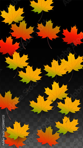 September Vector Background with Golden Falling Leaves. Autumn Illustration with Maple Red, Orange, Yellow Foliage. Isolated Leaf on Transparent Background. Bright Swirl. Suitable for Posters.
