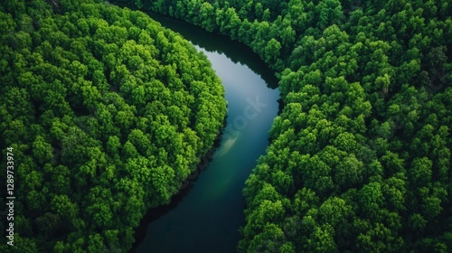 Serene Aerial View of Lush Green Forest Surrounded by Calm River in Bright Daylight