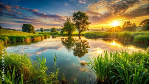 Serene Agricultural Pond at Sunrise: Rule of Thirds Composition