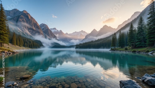 Serene Alpine Lake at Sunrise Misty Dawn Reflecting on Crystal Clear Waters