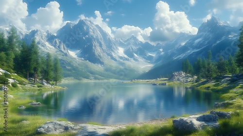 Serene alpine lake reflecting majestic snow-capped mountains under a bright sky.