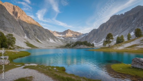 Serene Alpine Lake Surrounded by Majestic Mountains and Lush Greenery in a Beautiful Natural Park Setting