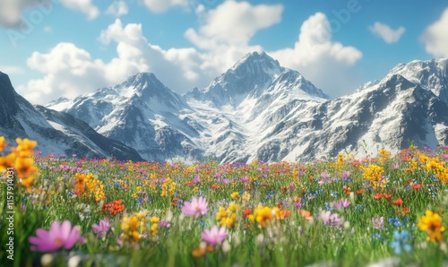 Serene alpine meadow with wildflowers blooming against a backdrop of towering snow-capped mountains.