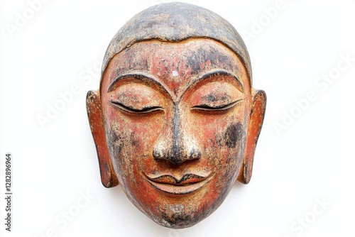 Serene Ancient Wooden Buddha Mask Displayed