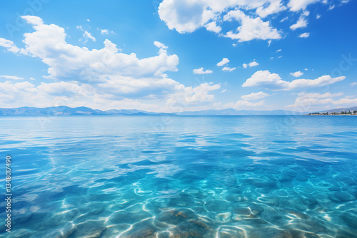serene and infinite expanse of a harmonious combination of a blue sea and sky on horizon, accompanied by playful clouds, evokes a natural symphony