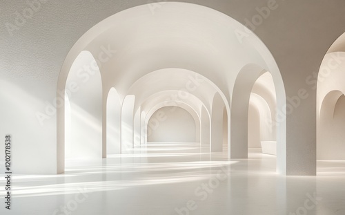 Serene and Minimalist Architectural Interior with Soft Light Streaming Through Arched Openings in a Modern Gallery Space