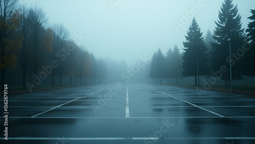 Serene and Moody: Flat Vector Illustration of Empty Rainy Parking Lot with Misty Trees