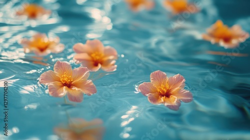 Serene aquatic scene of delicate peach blossoms floating gracefully on tranquil turquoise water surface