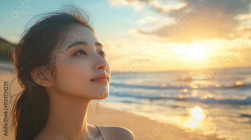 Serene Asian Woman Contemplating the Ocean Horizon on a Tranquil Sandy Beach