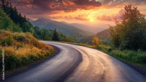 Serene asphalt road with stunning mountain scenery under a sunset sky High quality image