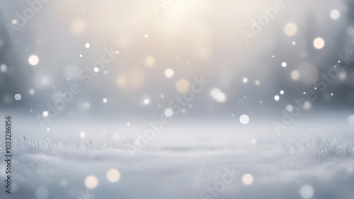 serene atmospheric landscape illustration depicting a winter scene with a soft focus on the foreground, which is covered in a blanket of snow and blurry bokeh background