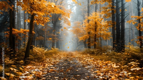 Serene Autumn Forest with Fallen Golden Leaves on Tranquil Path