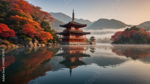 Serene Autumn Landscape With Traditional Pagoda Surrounded by Vibrant Foliage and Misty Mountains at Dawn