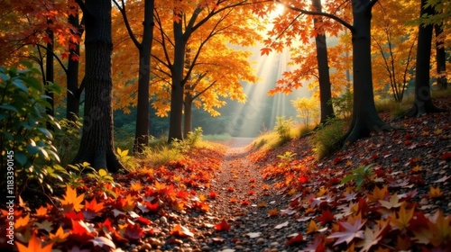 Serene Autumn Path Sunbeams Illuminate a Gravel Road Lined with Vibrant Red and Orange Leaves