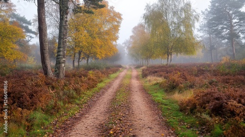 Serene autumn pathway through misty forest showcasing vibrant foliage and tranquil atmosphere