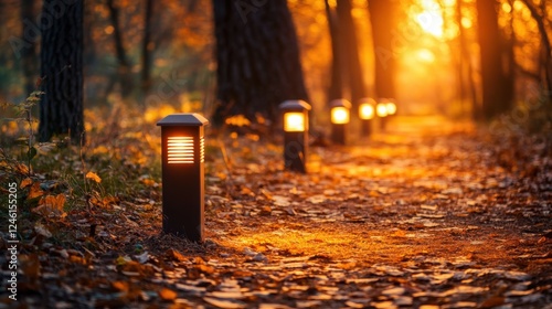 Serene Autumn Pathway with Lanterns Illuminating Fall Landscape