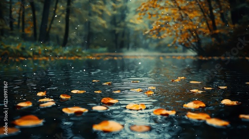 Serene Autumn River Scene Golden Leaves and Gentle Rain