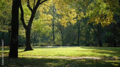 Serene Autumn Scene in Park with Vibrant Foliage and Soft Sunlight Casting Shadows on Green Grass