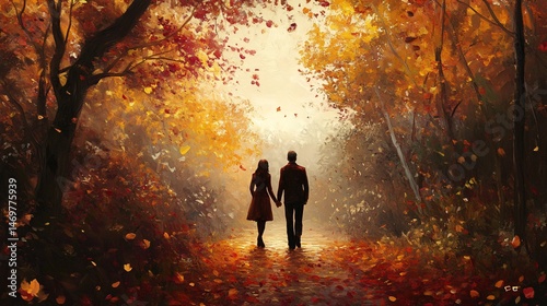 Serene Autumn Stroll: Couple walking romantically on colorful fallen leaves in the park