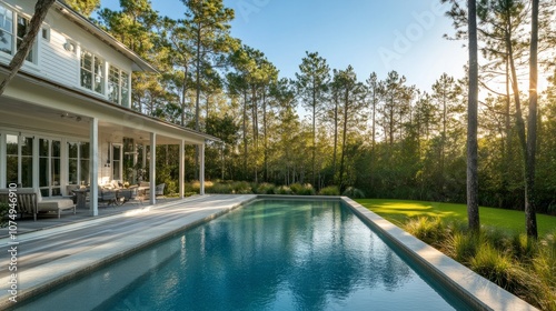 Serene backyard of a luxurious white and wooden home with sparkling pool waters, surrounded by tall pines and open green space