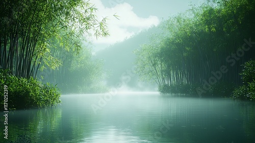 Serene Bamboo Forest by Calm Waterway at Dawn