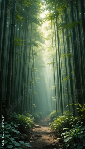 Serene Bamboo Forest Pathway with Soft Light and Greenery