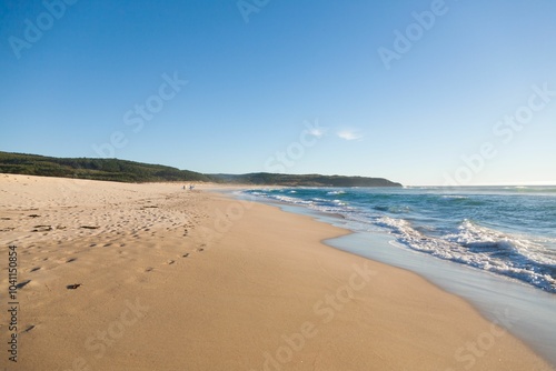 Serene beach landscape with golden sand and gentle waves.