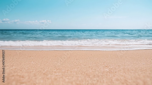 Serene Beach Landscape with Golden Sand and Gentle Waves Under a Bright Blue Sky